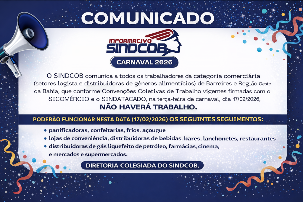 COMUNICADO O Sindicato dos Comerciários de Barreiras e Região Oeste da Bahia – SINDCOB, comunica a todos os trabalhadores do setor de mercados e supermercados, que fechou acordo na Convenção Coletiva de Trabalho 2025/2026, e os salários foram reajustados. A partir...