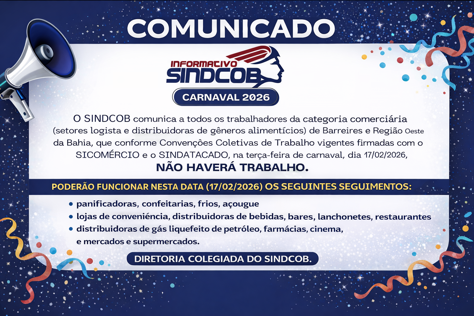 O Sindicato dos Comerciários de Barreiras e Região Oeste da Bahia – SINDCOB, comunica à categoria comerciaria do Setor Lojista que a Convenção Coletiva de...