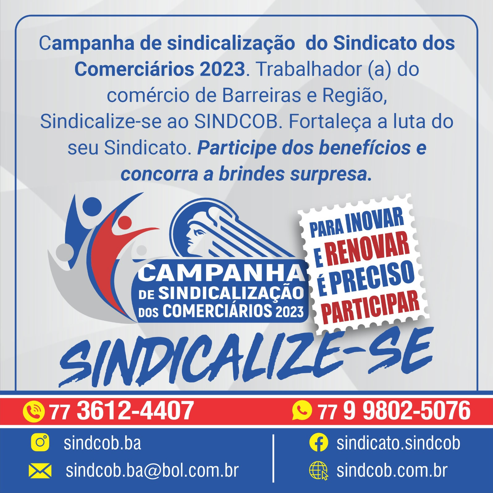 Trabalhador(a) do comércio de Barreiras e Região. Sindicalize-se ao SINDCOB.